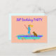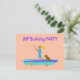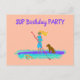 Tarjeta postal de invitación para fiesta de cumpleaños de adolescente con tema de remo en paddleboard. El diseño ilustrado muestra a una niña remando su tabla con su perro a bordo, mientras una tortuga marina nada junto a ella. Personalice el texto de la plantilla en la parte delantera y trasera para una reunión de fiesta de remo. La dirección de correo se puede agregar por separado a cada invitación de la fiesta.