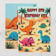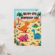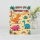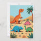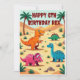 Una vibrante y divertida tarjeta de invitación a una fiesta de cumpleaños con tres adorables dinosaurios en un paisaje prehistórico tropical con palmeras y colinas. El texto alegre en la parte superior celebra el sexto cumpleaños de un niño, lo que la convierte en un diseño perfecto para una celebración con tema de dinosaurios. El estilo cálido y amigable de la tarjeta y sus colores brillantes atraen a los niños pequeños y crean emoción por la fiesta. Personalizable para diferentes edades y nombres.