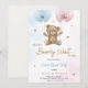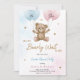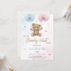 "Tarjeta de invitación para una fiesta de revelación de género con un osito de peluche lindo que sostiene globos azules y rosas. El texto dice '¿Él o Ella, apenas podemos esperar para ver.' El diseño es juguetón y acogedor. La tarjeta incluye detalles de la fiesta en la parte inferior."