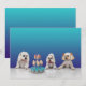 Cupcakes y cachorros te invitan a una celebración especial. Tres adorables cachorros rescatados traviesos mirando un carrusel de cupcakes en la parte frontal, fondo degradado azul en la parte posterior. Personaliza con la información de tu fiesta.
