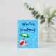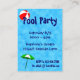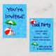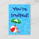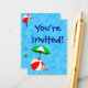 Una plantilla de entrada para evento o invitación personalizada del tamaño de una tarjeta de presentación con arte de una sombrilla de piscina y pelota de playa sobre azules acuáticos. Personalízala para agregar tu nombre o mensaje, incluso guarda tu diseño para más adelante.