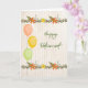 Alegre tarjeta de retiro con globos y flores en un fondo beige. Las flores son naranjas y amarillas y los globos son rosados, amarillos y verdes. Gracias a los recortes de diseño y al Hungryjpeg por algunos de los elementos del diseño.