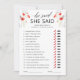 Prepárate para agregar un toque de elegancia a tu ducha nupcial de verano o primavera con nuestro juego de ducha nupcial de acuarela roja 'Él dijo Ella dijo'. Esta tarjeta de juego de ducha nupcial personalizable presenta impresionantes flores rojas pintadas a mano con acuarela y caligrafía elegante, lo que la convierte en la adición perfecta para tu celebración.