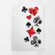 Fondo gris, texturado con símbolos de cartas de juego poligonales. Símbolos de cartas de juego, corazón, diamantes, pala y club.
