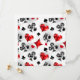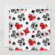 Fondo gris, texturado con símbolos de cartas de juego poligonales. Símbolos de cartas de juego, corazón, diamantes, pala y club.