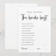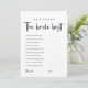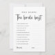 Eleva tu despedida de soltera con nuestra tarjeta de juego personalizable "¿Quién conoce mejor a la novia?". Con un diseño minimalista en blanco y negro, este juego añade un toque divertido a tu celebración. Los invitados pueden poner a prueba sus conocimientos sobre la novia con preguntas de trivia personalizadas, lo que lo convierte en el complemento perfecto para tus fiestas de último adiós antes de la boda.