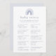 Esta tarjeta de juego de trivia con niños arco iris con ducha de bebé de la colección Rowan es perfecta para una simple ducha de bebé o rociada de bebé. Este bonito diseño minimalista presenta un arco iris blanco y azul claro único y es perfecto para primavera o verano. CLAVE DE RESPUESTA DE TRIVIA DE BEBÉ: 1.B, 2.C, 3.A, 4.B, 5.C, 6.D, 7.C, 8.C, 9.B, 10.A