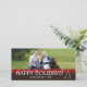Tarjeta de la foto de la familia buenas fiestas con un tema rojo y marrón y un árbol de navidad blanco