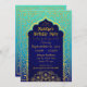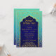 Tarjeta de la invitación de la fiesta de cumpleaños del tema de Bollywood o de las noches árabes en azul real, trullo, y ombre de la aguamarina con acentos del efecto metalizado de oro.
