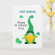 Una tarjeta de saludo divertida para tu bisnieto en el Día de San Patricio, con un lindo leprechaun, sosteniendo un shamrock. El leprechaun tiene un gorra muy alto, en un patrón verde, una gran barba de jengibre, una nariz enorme, mangas rayadas y calcetines y zapatos negros. En la parte superior, con letras de color verde oscuro, está la palabra "GRANDSON GRANDE" y el mensaje interior es fácil de personalizar o borrar.