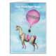 Una llama caprichosa y florida huye con la ayuda de un globo de aire caliente de época.