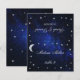 Una tarjeta de lugar para una boda celestial con el nombre del invitado y el número de la mesa impresos en su parte frontal y los nombres de los novios y la fecha de la boda impresos en el otro lado (es decir, la otra mitad, antes de doblarla). Todo el texto es una caligrafía gris claro, casi blanco. El fondo es el cielo nocturno con la luna y las estrellas alrededor del texto. La luna y las estrellas son de un gris plateado (hoja de plata falsa).