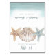 Diseñado para coordinar con mi colección de bodas de estrellas de mar, esta es una tarjeta de lugar perfecta para una boda náutica o con tema de playa. La parte delantera presenta estrellas de mar de acuarela y una concha con plantillas de texto para escribir nombres y números de mesa. La parte posterior presenta los nombres de los novios y la fecha de la boda acentuados por olas del océano pintadas a mano. El interior de la tarjeta es azul puerto.
