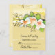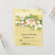 Tarjeta de lugar de boda personalizada con plumeria e hiedra amarilla y blanca, con hermosas plumerias blancas y naranjas y hiedra sobre fondo amarillo desgastado. Naranja, blanco, verde, amarillo. Dobla la tarjeta por el centro.