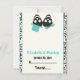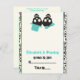 Tarjeta de lugar de boda de Halloween con cráneos elegantes turquesa, que presenta una pareja de cráneos negros de novios en fondo marfil y un borde con patrón de cráneos. El novio lleva un sombrero azul turquesa y la novia un lazo azul turquesa. Dobla la tarjeta por el centro.