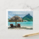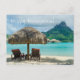 Tarjeta de luna de miel con una sombrilla de paja y dos tumbonas sobre una playa de arena blanca en un complejo de bungalows sobre el agua de lujo y texto: '¡Feliz luna de miel!'