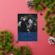 Tarjeta fotográfica navideña de Navidades festivos con marco decorativo curvilineal de copos de nieve con acentos de Relieve metalizado dorado.