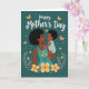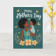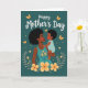 Este diseño muestra a una mujer de piel oscura con cabello rizado y abundante acunando a un bebé de rostro redondo cerca, sus ojos se encuentran con una mirada tierna y afectuosa ❤️. El fondo es un azul teal profundo, lo que da a la escena un ambiente tranquilo e íntimo que te atrae hacia sus rostros. Un pequeño arete de oro capta la luz cerca de su mejilla, y ambas figuras tienen toques de mejillas sonrosadas y labios de color suave. Alrededor de ellos, flores amarillo-anaranjadas y hojas verdes surgen desde la parte inferior y se curvan a lo largo de los lados como un marco de jardín, agregando una suavidad suave y romántica al momento. Pequeñas mariposas naranjas flotan a través de la escena, trayendo un movimiento ligero y aéreo 🌼. Cerca de la parte superior, un breve saludo aparece en letra blanca, centrado sobre las figuras y fácil de leer contra el fondo oscuro. La paleta de colores se mantiene cálida y equilibrada, con las flores que repiten los tonos sonrosados del bebé y