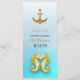 Tarjeta de menú Boda azul Aqua con tema de playa Oceanic Beach con caballitos de mar y anclas dorados.