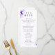 El diseño presenta imágenes de delicados violetas en las esquinas superior izquierda e inferior derecha. El Monograma de Novia y Groom se muestran en la parte superior seguido por el encabezado Menú y las opciones de menú. Todo el texto es personalizable. Al revés hay una cruz y una imagen más grande de un ramo violeta. Diseñado para coordinar con la "Elegante suite Boda católica violeta".