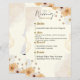 esta elegante carta de menú de bodas presenta un romántico tema crema y florido, y presenta el menú de la cena en un formato elegante y fácil de leer. En la parte delantera se sirven entrantes, platos principales, postres y bebidas con tipografía delicada y acentos florales suaves. La parte trasera está decorada de forma coordinada, con un aspecto cohesivo y sofisticado desde todos los ángulos. Perfecto para bodas clásicos, recepciones en el jardín o cualquier evento romántico, esta carta de doble cara le da un toque de elegancia intemporal a su mesa. Personalizable completo para incluir los elementos de menú y los detalles del boda únicos.