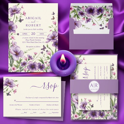 Flores púrpura y rosa acuarela estilo primavera carta de menú de presupuesto de boda. En esta carta de menú de bajo presupuesto se exhibe una hermosa acuarela floral de una flor morada anémona, acentuada por la flor rosa, las hojas y la mariposa en la esquina superior izquierda. Un color púrpura sólido proporciona un acabado sencillo y elegante en la parte posterior.