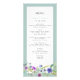 Esta carta de menú es una auténtica obra de arte que refleja la belleza y el romanticismo de esta ocasión especial. La parte delantera está decorada con un impresionante jardín florido compuesto por delicadas acuarelas con flores silvestres en color morado y azul, con hojas verde azulado-verde. Esta hermosa pantalla está rodeada por un bonito borde azul claro que le da un toque de elegancia. En la parte trasera, las iniciales de la pareja feliz están envueltas en un encantador marco redondo decorado con acentos florales. La cobertura se ha diseñado utilizando algunos activos de Freepik.com