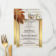 Una carta de boda chic y chic, con hojas de otoño coloridas, sobre un rústico panel de madera blanca, enmarcada por un revestimiento dorado y unos baños metálicos festivos. Una carta bonita y elegante para una cena de otoño.