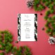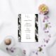 Relieve metalizado dorado dorado real Esta tarjeta de menú boda se muestra en un elegante Relieve metalizado blanco y dorado de las palmas tropicales, escritura y texto estándar en color negro. Personalice este elemento y cambie el texto al suyo con esta plantilla. Elija su cantidad, más una imagen de stock de descuento.