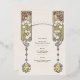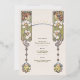Añada un toque de elegancia a su recepción nupcial con esta tarjeta de menú de bebidas Bodas de estilo Art Nouveau. La parte delantera de la tarjeta presenta un bonito diseño Art Nouveau con intrincados patrones florales y geométricos en suaves tonos pastel. Dos elegantes perfiles femeninos adornan la parte superior, mientras que la parte inferior exhibe un delicado motivo floral, creando un aspecto armonioso y sofisticado. La parte trasera de la tarjeta muestra un emblema floral refinado que aporta un toque atemporal a la decoración boda. Perfecto para los bodas con temática vintage, esta carta de bebidas es una forma elegante de presentar a sus huéspedes cócteles, cervezas y vinos.
