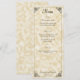 Tarjeta de menú boda con texto negro sobre fondo de papel de pergamino de color marrón.