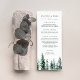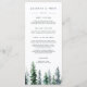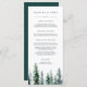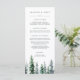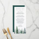 Nuestro menú de boda rústico elegante presenta sus platos de entrada, platos principales y postres acentuados con una fila de pinos pintados con acuarela en verde cazador y verde bosque. Coordina con nuestra colección de bodas Timber Grove.
