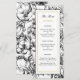 ¡Una tarjeta de menú decadente y hermosa digna de una realeza! Los dibujos florales botánicos grabados y las fuentes sans serif elegantes le dan un toque vintage, pero con un sentimiento regio. El borde de color dorado y el rollo lo levantan todo y se destacan contra el negro y blanco. Es perfecto para una pareja que quiere agregar un toque de lujo a su gran día.