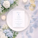 Tarjeta de menú de boda French Blue 5x7 con delicado arte de hortensias y tipografía serif atemporal, un detalle refinado de la mesa que eleva instantáneamente tu recepción.