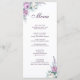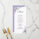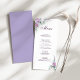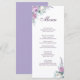 Esta tarjeta de menú de boda lavanda-púrpura presenta peonías, lavanda, formas geométricas y tipografía moderna elegante de acuarela blanca y púrpura. Ideal para una boda al aire libre. Encuentre artículos coincidentes en la colección de boda floral lavanda púrpura.