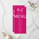 Esta moderna y audaz tarjeta magenta de menú es la combinación perfecta entre lo moderno y lo elegante de su día especial. Esta tarjeta presenta un vibrante matiz magenta que capta el ojo y el corazón, lo que le da un tono memorable a su fiesta boda. Diseñada pensando tanto en la belleza como en la funcionalidad, la parte delantera de la tarjeta ofrece un menú cuidadosamente seleccionado, desde aperitivos hasta postres, en un formato claro y acogedor. Cada plato se presenta con una fuente moderna que complementa el llamativo color de la tarjeta, asegurando que los clientes se entusiasmen con las delicias culinarias que les esperan. Si pasas la tarjeta, verás un mensaje de agradecimiento sincero, un gesto atento para expresar tu agradecimiento por la presencia de tus invitados en esta memorable ocasión. El mensaje es elaborado en un tono cálido y cortés, recordando a amigos y familiares el importante papel que juegan en sus vidas. Este toque personal no sólo añade el encanto de su boda, sino que también deja una impresión duradera en sus seres queridos.