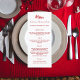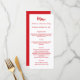 tarjeta de menú de cena de fiesta de Navidad. Personalice y agregue un nombre/evento, fecha y menú. Un fondo blanco en la parte frontal, texto rojo. Parte posterior: fondo rojo