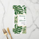 Hojas tropicales, carta de menú verde y boda dorado. El diseño de este bonito incluye hojas de Split Leaf Philodendron (Monstera deliciosa) o hojas de queso suizo y hojas de palma en verde con contorno de oro. Su redacción está en un marco blanco con un contorno dorado.
