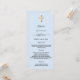 Baptismo, carta de menú de recepción con encanto. Personalice y agregue un nombre, fecha y menú. Fondo azul claro y cruz dorada.