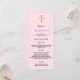 Baptismo, carta de menú de recepción con encanto. Personalice y agregue un nombre, fecha y menú. Un fondo pastel rosa claro y una cruz dorada.