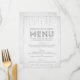 Esta encantadora tarjeta de menú diseñada por The Spotted Olive™ presenta un bonito fondo gris plateado suave con una imagen de gemas que fluyen desde la parte superior y la palabra "Menú" estilizada con una imagen de purpurina plateada. POR FAVOR, TENER EN CUENTA: ESTE DISEÑO SOLO PRESENTA UNA IMAGEN IMPRESA DE PURPURINA; NO SE UTILIZA NI SE INCLUYE PURPURINA FÍSICA; NO HAY EMBELLECIMIENTOS.