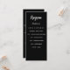 Programa y tarjeta de menú. Personalice y agregue su nombre, fecha y menú. Fondo negro, texto blanco.
