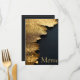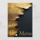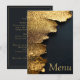 Esta impresionante tarjeta de menú presenta una textura de pan de oro lujosa combinada con un fondo negro elegante y tipografía dorada refinada. Ideal para bodas, banquetes o eventos de cena formal, este diseño complementa perfectamente temas modernos y de lujo. Presenta el menú de tu evento con esta pieza de papelería elegante y sofisticada.