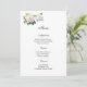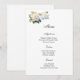 La tarjeta de menú se muestra con una hermosa gardenia floral en el papel de tarjeta de firma en blanco.