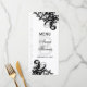 © 2013 Socialite Designs. Nuestra elegante tarjeta de menú boda personalizada tiene flores / remolinos de color negro y gris plateado en la parte delantera y trasera. En la parte delantera se incluyen los nombres de la pareja y la fecha del boda. La parte posterior incluye los elementos del menú. Póngase en contacto con Socialite Designs si necesita ayuda para personalizar esta tarjeta de menú para su evento.