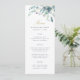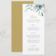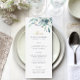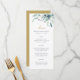 Tarjetas de menú boda impresas por personalizado. Utilice las herramientas de diseño para personalizar el diseño, los colores de fondo y el texto con los detalles del menú boda. Este elegante diseño cuenta con un borde floral acuático de suculenta vegetación y flores con texto dorado y marino.