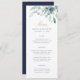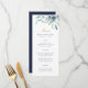 Tarjetas de menú boda impresas por personalizado. Utilice las herramientas de diseño para personalizar el diseño, los colores de fondo y el texto con los detalles del menú boda. Este elegante diseño cuenta con un borde floral acuático de suculenta vegetación y flores con texto dorado y marino.
