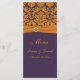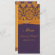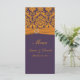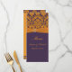 Esta tarjeta de menú naranja y damasco morado coincide con la invitación que se muestra a continuación. Está diseñado en una tarjeta de rack con un frente brillante y acabado mate en la parte posterior. Si desea que una tarjeta de menú en papel de invitación coincida con sus invitaciones, o si tiene alguna solicitud de artículos o cambios adicionales, envíe un correo electrónico a niteowlstudio@gmail.com con su solicitud.