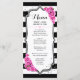 Tarjeta de menú. Diseño elegante en negro blanco rosa con falso brillo plateado. El diseño floral presenta rayas negras y blancas y rosas rosadas. Perfecto para una fiesta elegante.