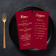 Programa y tarjeta de menú. Personalice y agregue su nombre, fecha y menú. Fondo de color borgoña, texto dorado.